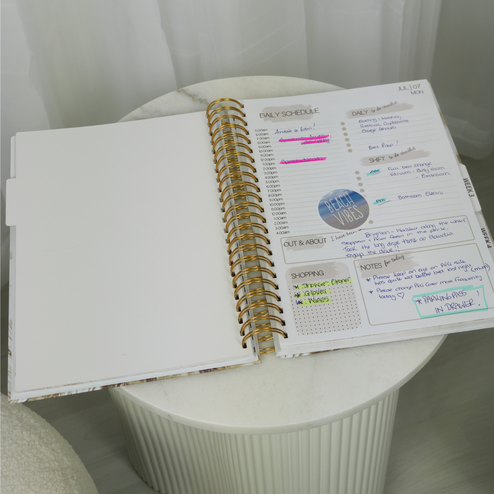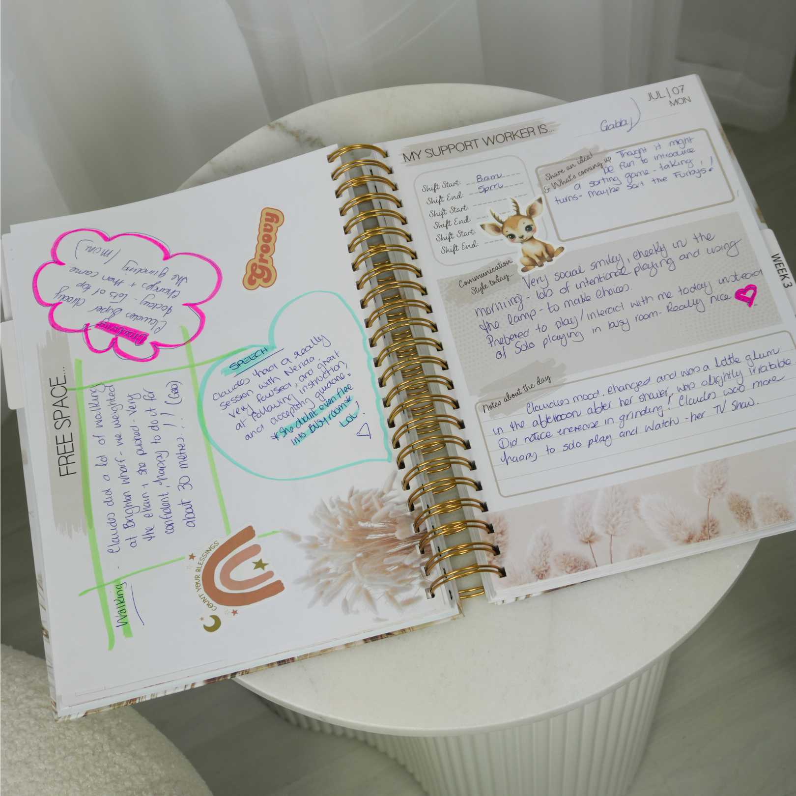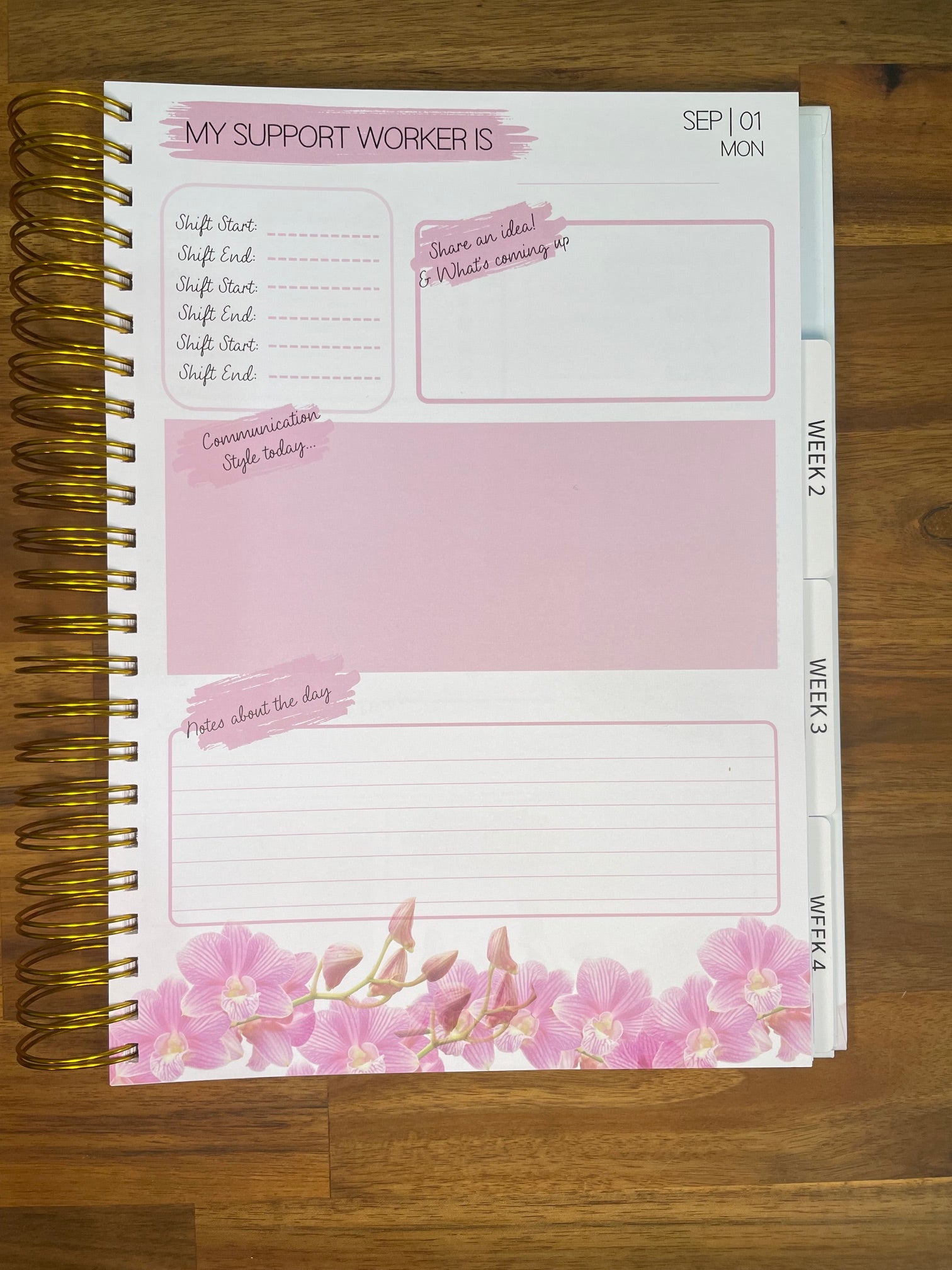 routines, appointments, mood tracking, and shift notes giving your support team a simple way to record and share what matters. Only the cover designs change throughout the year. The structure inside stays the same - calm, practical, and easy to use.